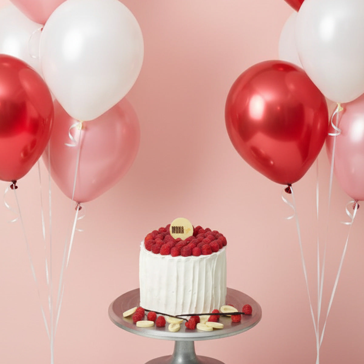 A light and fluffy delight — the Raspberry Dream Cake & Helium Balloons Combo combines vanilla sponge with layers of fresh raspberries and cream.